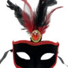 - Kırmızı dantel, siyah ve kırmızı tüyler ve siyah süet kaplama ile süslenmiş göz alıcı bir parti maskesi tasarımı.